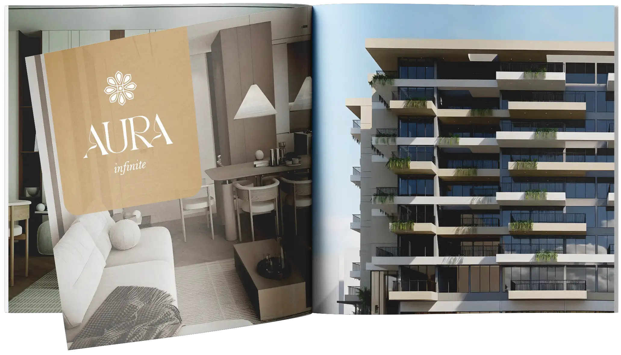 The exterior is in a modern minimalist style: straight lines, a neat facade, large windows and spacious balconies. Inside this property in Dubai, there are bright interiors in neutral tones, combining warm textures and simple shapes. Panoramic windows provide plenty of natural light, and the layouts of the apartments at Aura Prestige are designed to make residents feel comfortable.