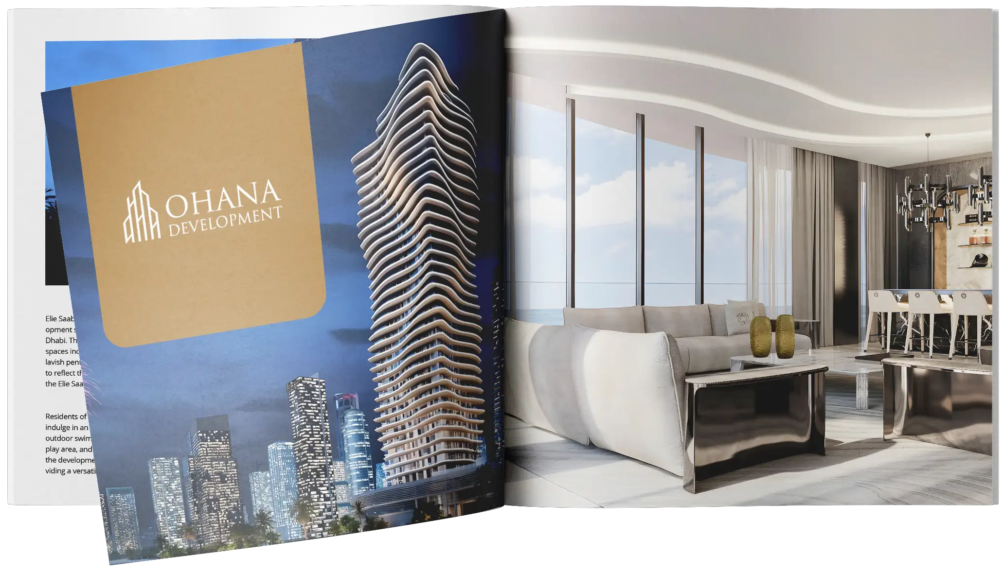 Elie Saab Waterfront by Ohana is a luxurious 35-story residential tower on Al Reem Island, Abu Dhabi, featuring 1-3 bedroom apartments and opulent penthouses. Amenities include pool, gym, kids' play area, landscaped gardens, and a multi-purpose lounge.