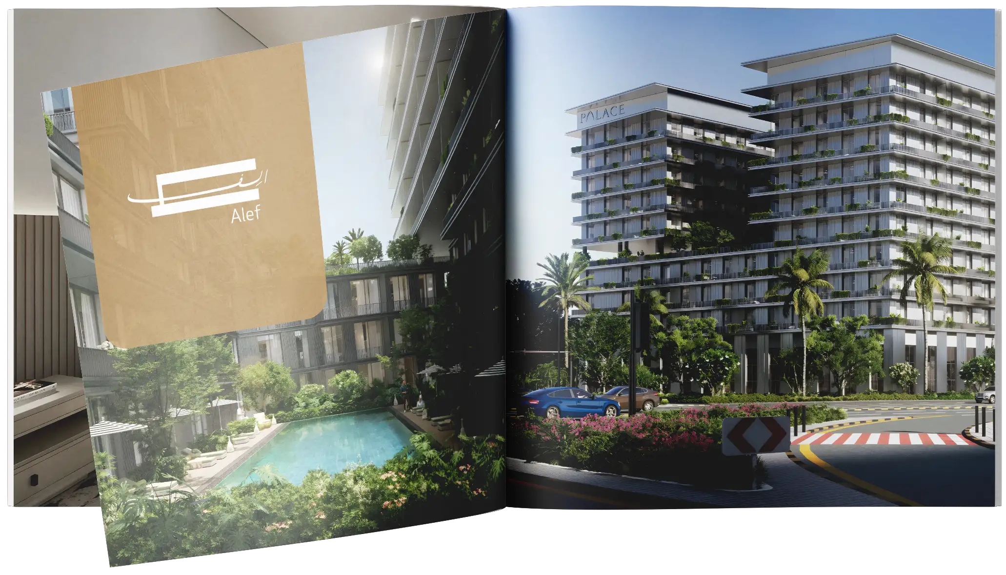 Palace Residences Al Mamsha is a residential development by Alef Group and hotel brand Palace in the pedestrianised Al Mamsha district of Sharjah. The project comprises two modern towers connected by a shared podium. The buildings are designed in a classic style: light-coloured facades, large windows, and smooth lines of balconies and terraces. The entrance lobbies resemble those of hotels: spacious halls, a reception desk, comfortable waiting areas, and a concierge service to assist residents with their daily tasks.