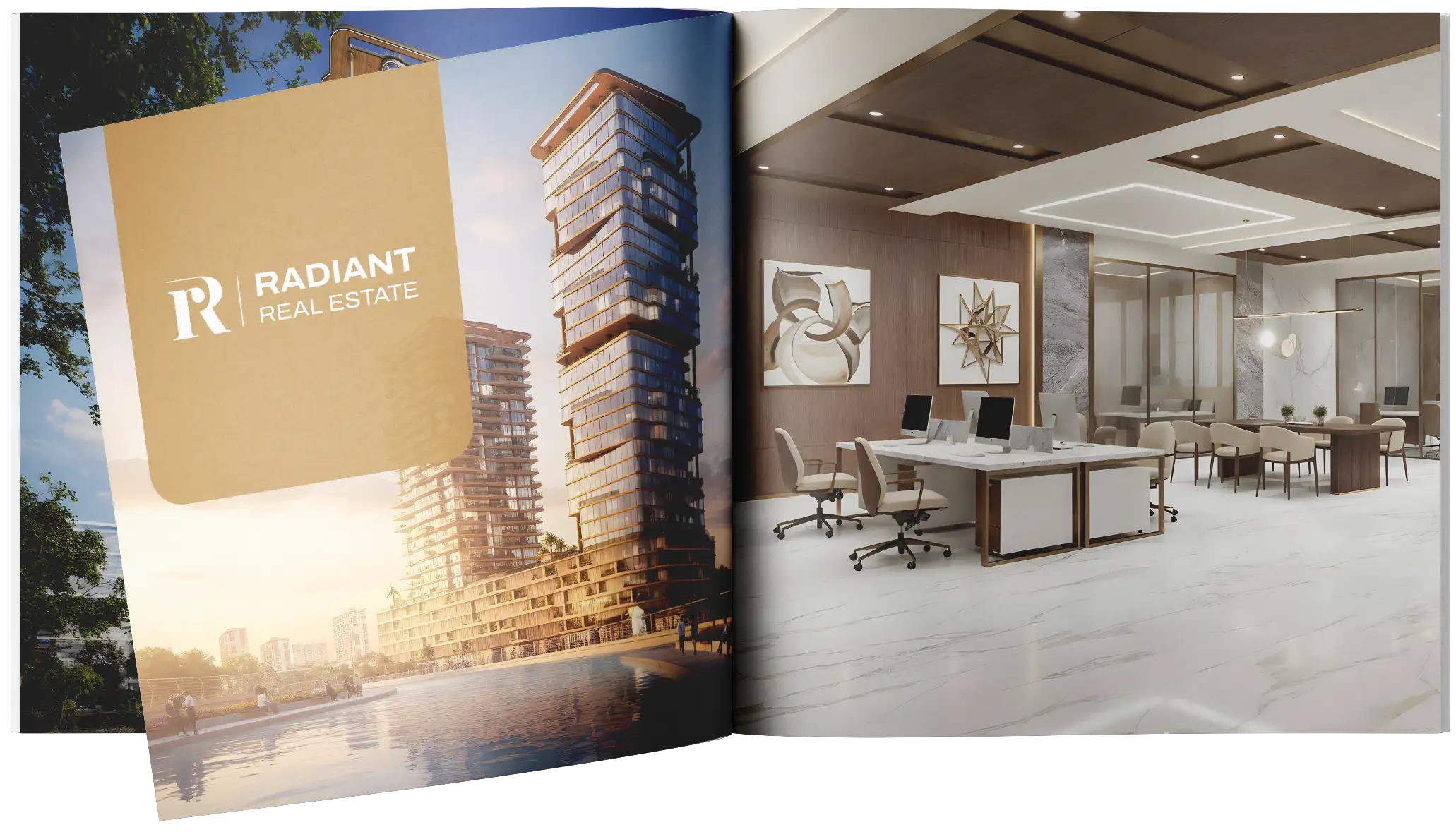 The property at Atrium Towers by Radiant Real Estate is represented by residential and commercial formats, including studios, 1- and 2-bedroom apartments, and Grade A offices.