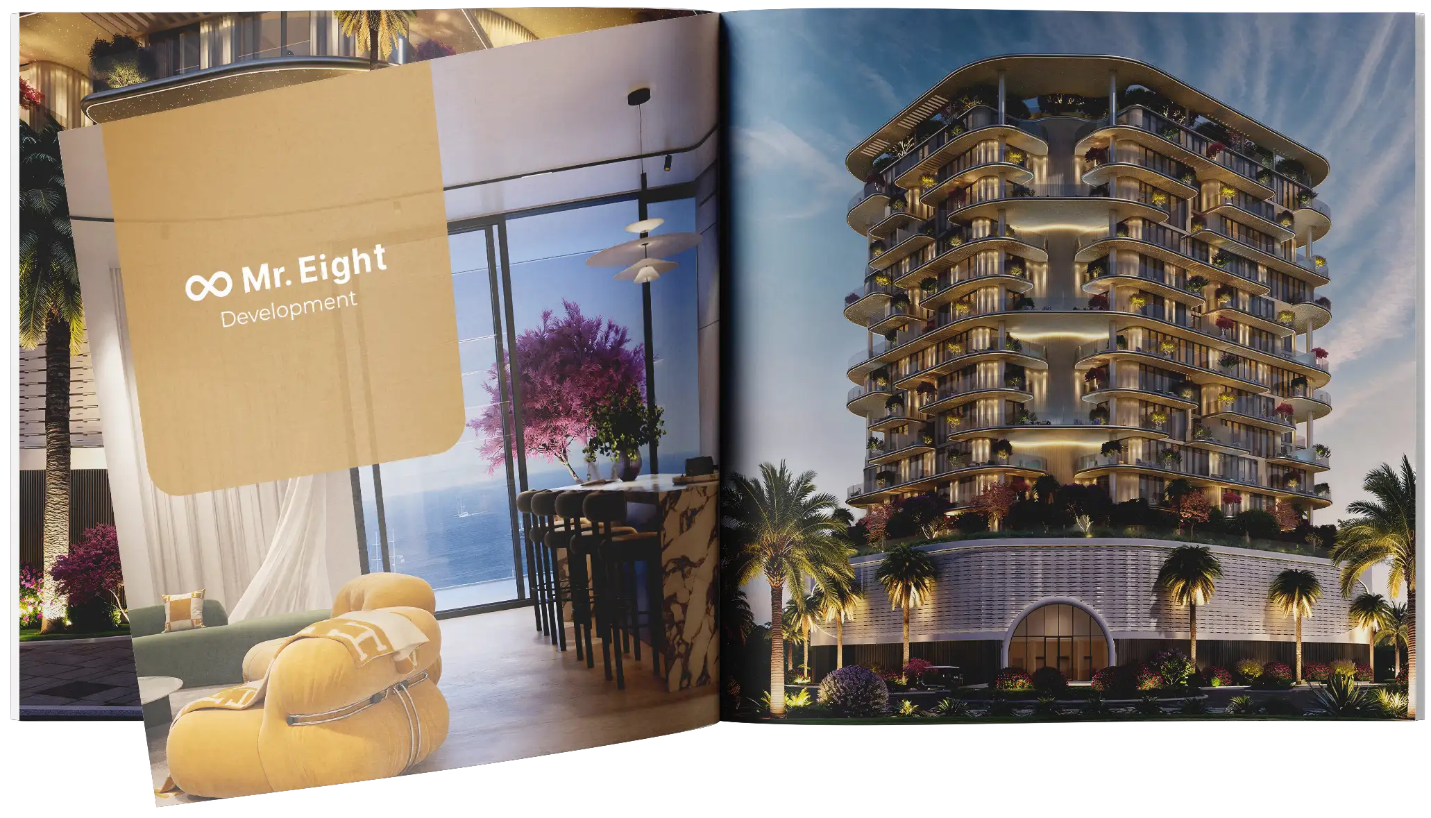 The project offers the following amenities: rooftop infinity pools, a modern fitness centre, a sauna, wellness areas, a tea room and quiet lounges. Residents have access to a golf course within a short drive. Mr. 8 Membership Club membership is included: priority concierge service, private events and additional privileges. For everyday mobility, chauffeur services in a Rolls-Royce are provided, and for water excursions, a Riva motorboat is available.