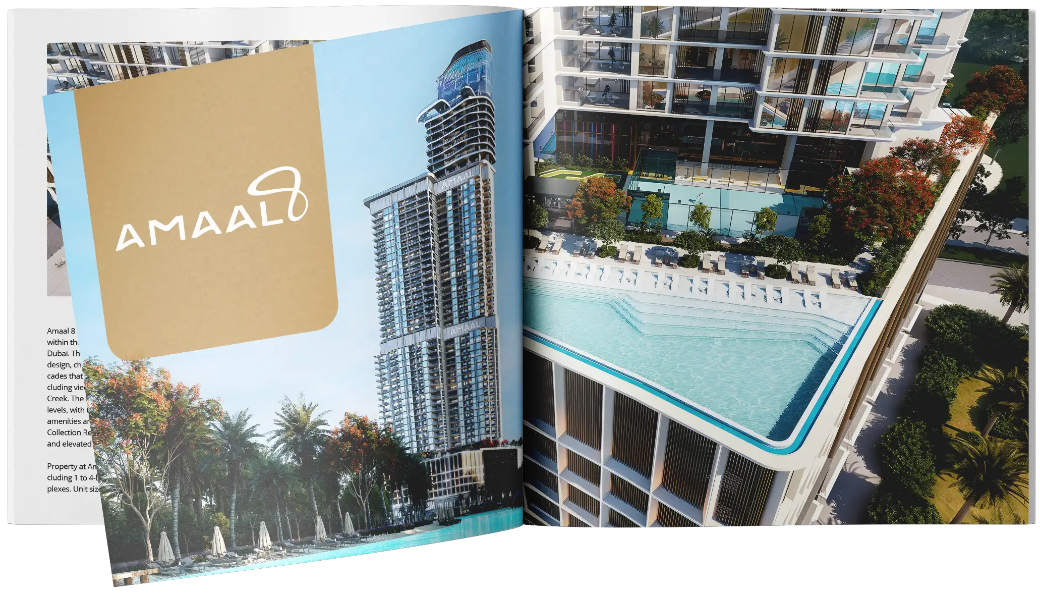 Amaal 8 — премиальный жилой комплекс в востребованном комьюнити Meydan Horizon в Дубае. Проект отличается оригинальным экстерьером, который характеризуется волнообразными террасами и изящными стеклянными фасадами, гармонирующими с окружающим ландшафтом. Из окон открываются панорамы заповедника Ras Al Khor Wildlife Sanctuary и Dubai Creek. В башне 49 этажей, расположенных над 8 уровнями подиума. Три этажа отведены под роскошные удобства, а 7 эксклюзивных уровней известны как Infinity Collection Residences. Это исключительная коллекция, разработанная для тех, кто стремится к приватности и высокому уровню жизни.