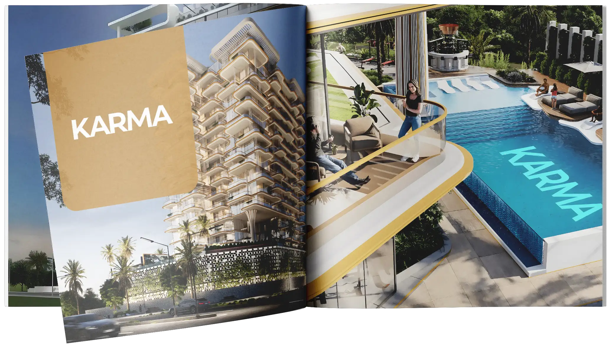 Antalya by Karma — 18-этажный жилой комплекс от международного девелопера Karma Developers, реализующего масштабные проекты в Дубае и за рубежом. Здание выполнено в современном стиле с плавными силуэтами, стеклянными фасадами и вертикальными зелеными акцентами, создающими визуальную легкость. В цветовой гамме преобладают белые и бежевые тона, а балконы с прозрачными ограждениями обеспечивают панорамные виды и дополнительный свет в комнатах.