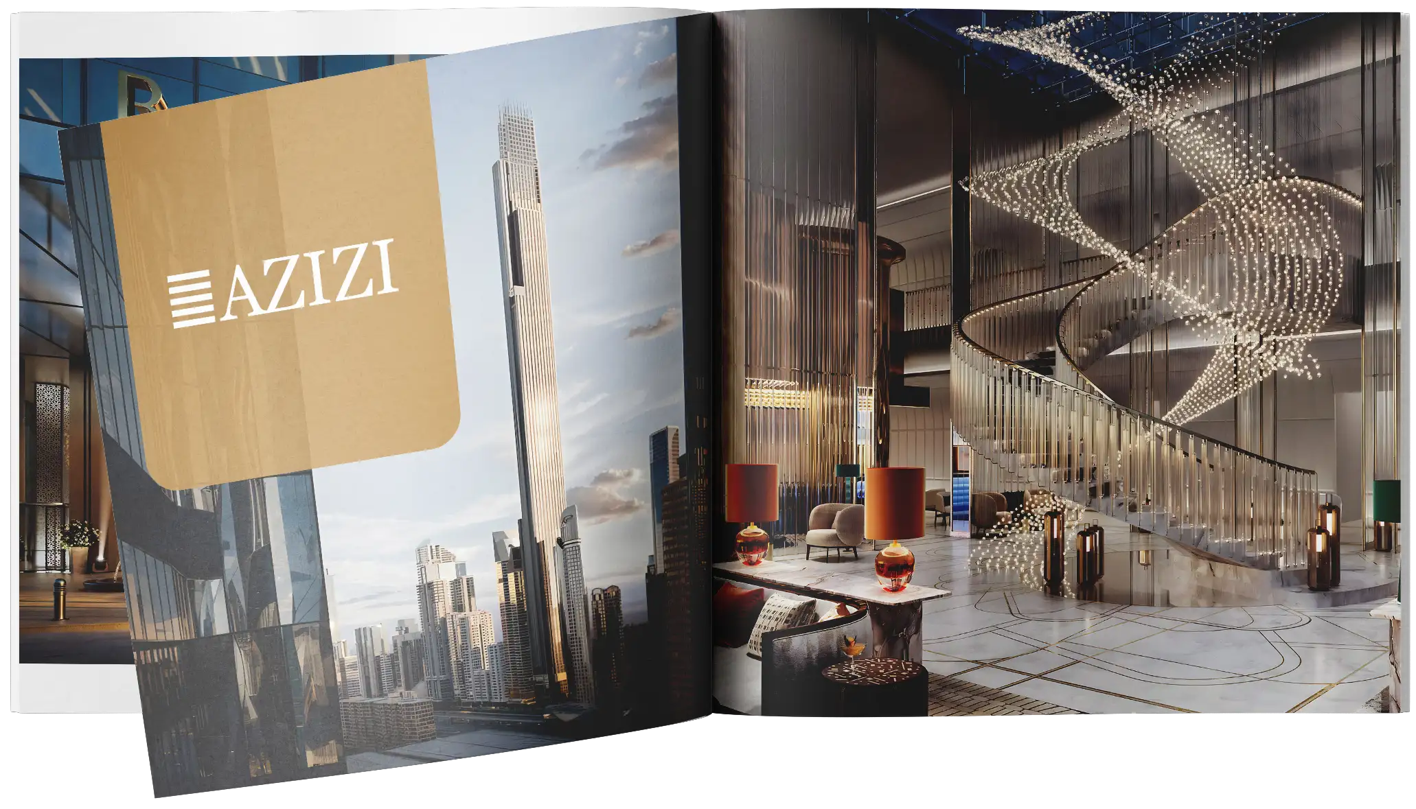 В Burj Azizi представлены апартаменты с 1 и 2 спальнями площадью от 73 м² до 200 м², и пентхаусы с 2, 3, 4 и 5 спальнями — от 185 м² до 386 м². Проектом также предусмотрен 7-звездочный тематический отель с обслуживаемыми резиденциями. Панорамные окна и просторные террасы обеспечивают красивые виды на окружающий городской ландшафт.
