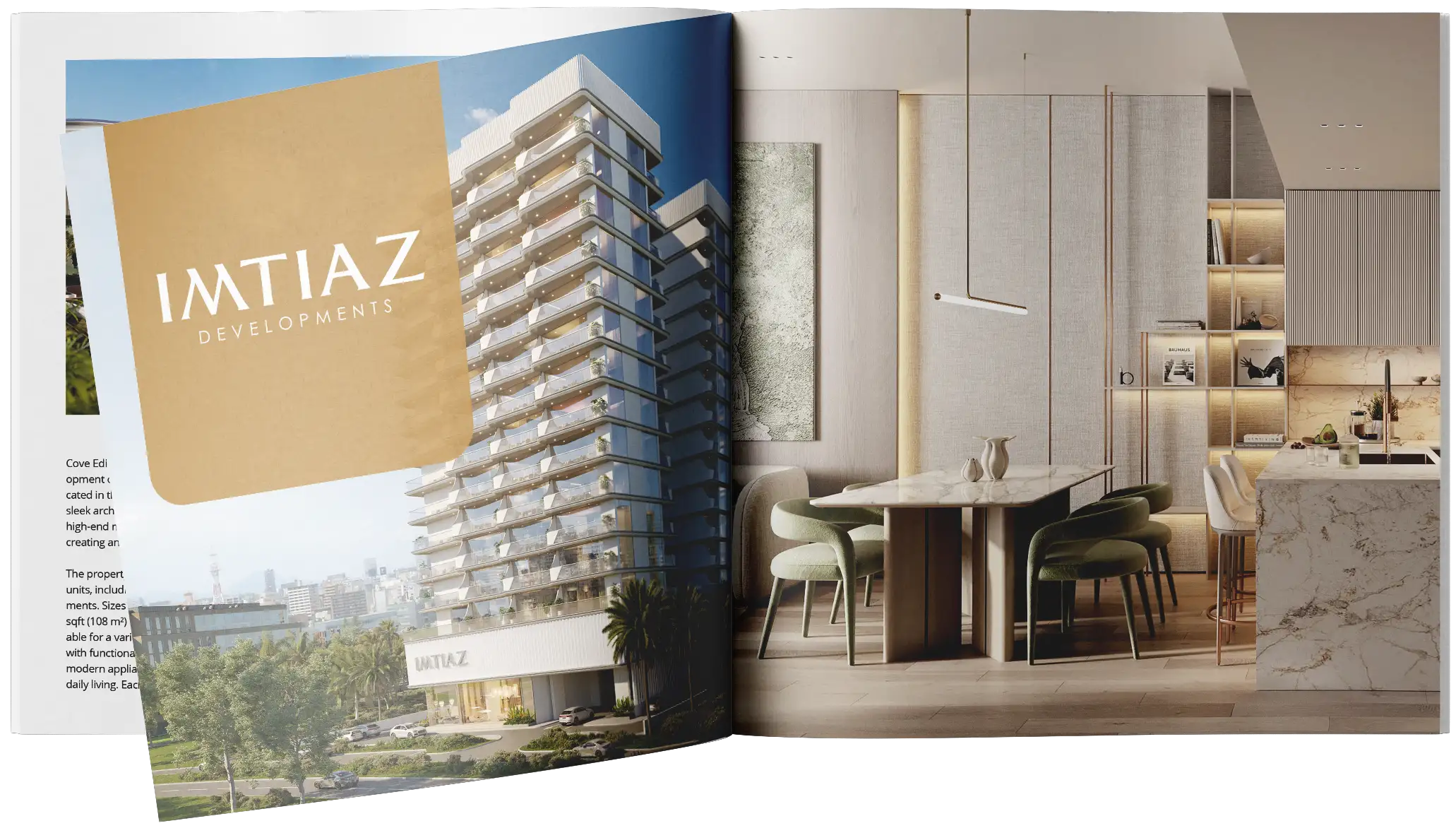 Cove Edition 2 by Imtiaz — изысканный комплекс, расположенный в динамично развивающемся районе Dubailand. В дизайне объединены элегантная архитектура и продуманные интерьеры, использованы высококлассные материалы, золотистые акценты и декоративные элементы из натурального дерева, что создает располагающую атмосферу.
