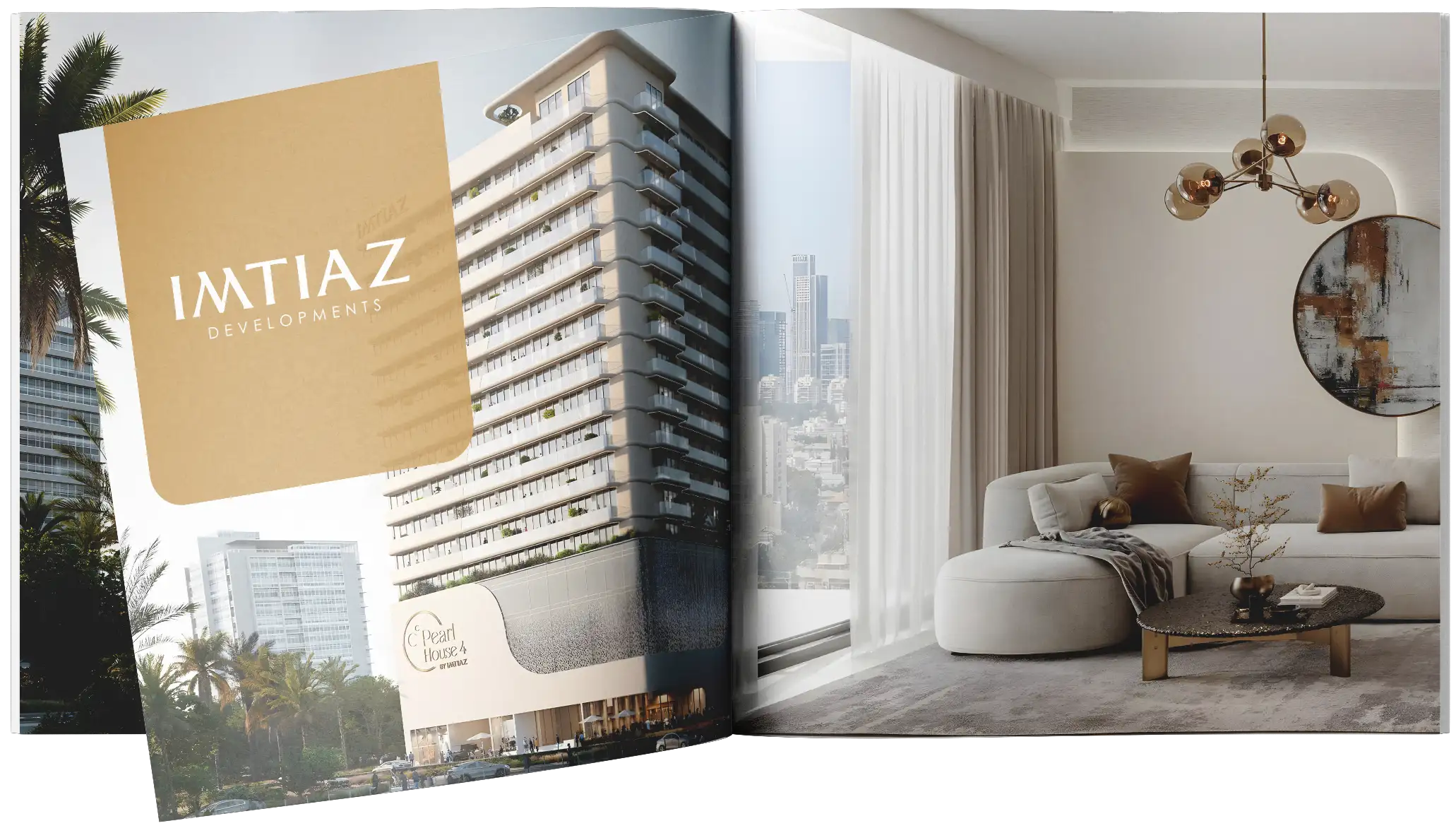 Особенности интерьеров апартаментов в Imtiaz Pearl House 4: продуманные системы хранения, высокие потолки и витражное остекление формируют светлые пространства. Застройщик делает акцент на тактильных материалах, спокойных тонах и продуманной компоновке — от гостиной до кухни.