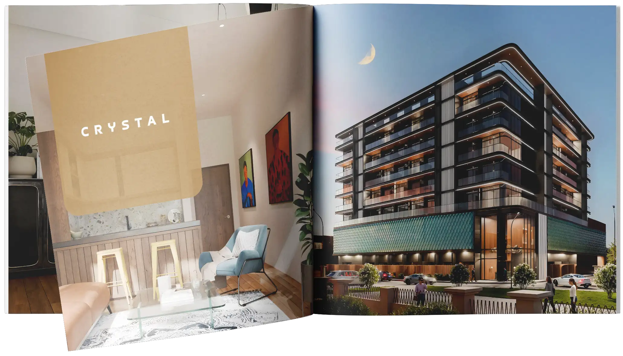 Opal by Crystal — бутиковый жилой комплекс в центре Jumeirah Village Circle. В названии зашифрована концепция проекта: как драгоценный опал преломляет свет, демонстрируя многогранность, так в архитектуре и дизайне воплощена идея «тихой роскоши». Камерный формат в 4 жилых этажа усиливает приватность, а парадный двойной свет в лобби задает тон всей концепции.