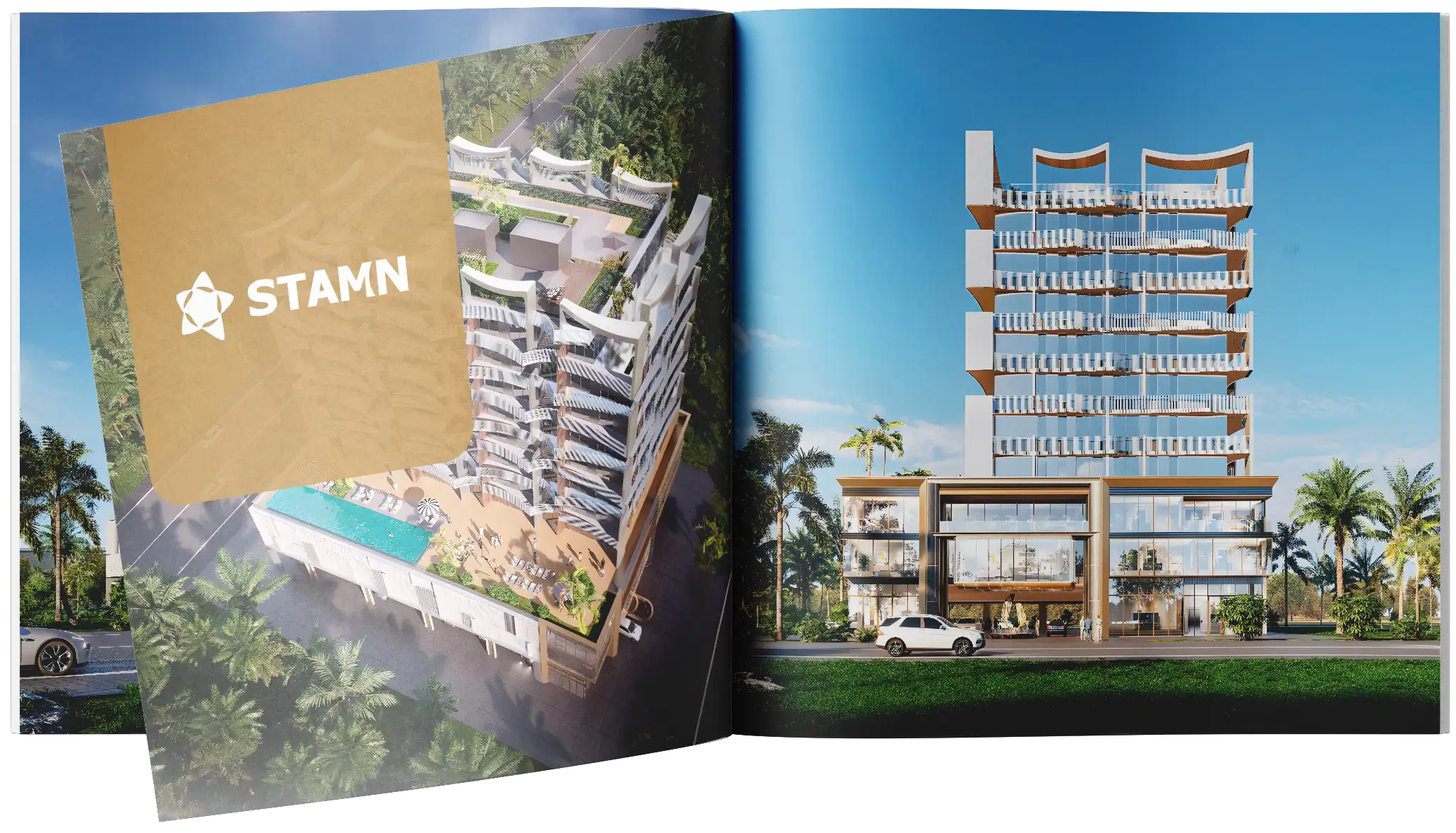 Stamn Nautis Residences on Dubai Islands — камерный жилой комплекс от китайского застройщика Stamn Development, для которого это уже третий проект в Дубае. 11-этажное здание с двумя подиумными уровнями выполнено в современном архитектурном стиле с лаконичными формами, светлыми фасадами, стеклянными балконами и панорамным остеклением.